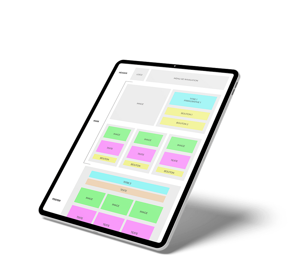 Dès que vos besoins sont établis, je crée un zoning afin de gérer de manière ergonomique la disposition des éléments d’une page web. On parle ici de header, ou entête, de contenu principal, de menu de navigation, du placement du logo, du placement des images, des textes ou encore du footer, ou pied de page.